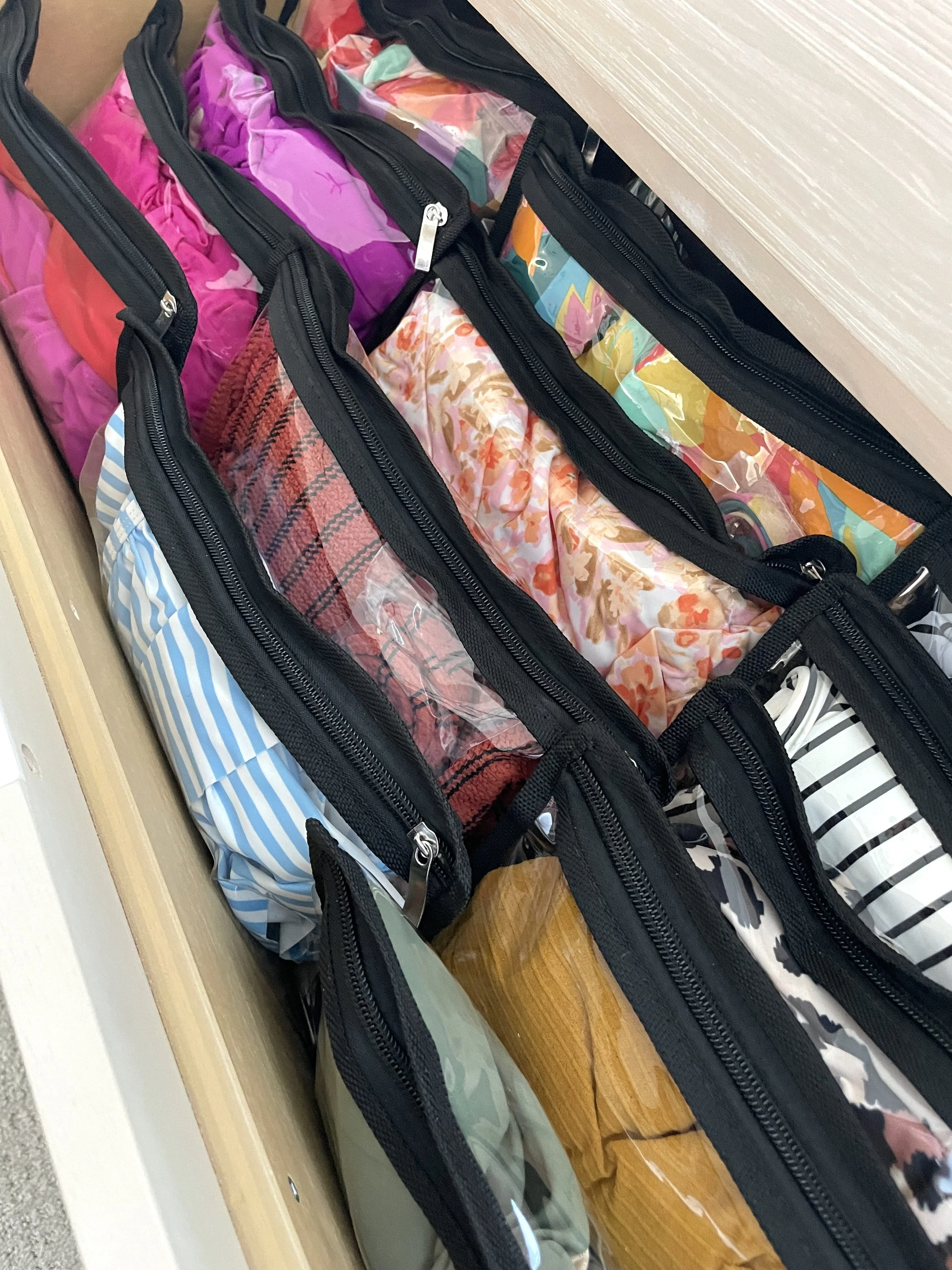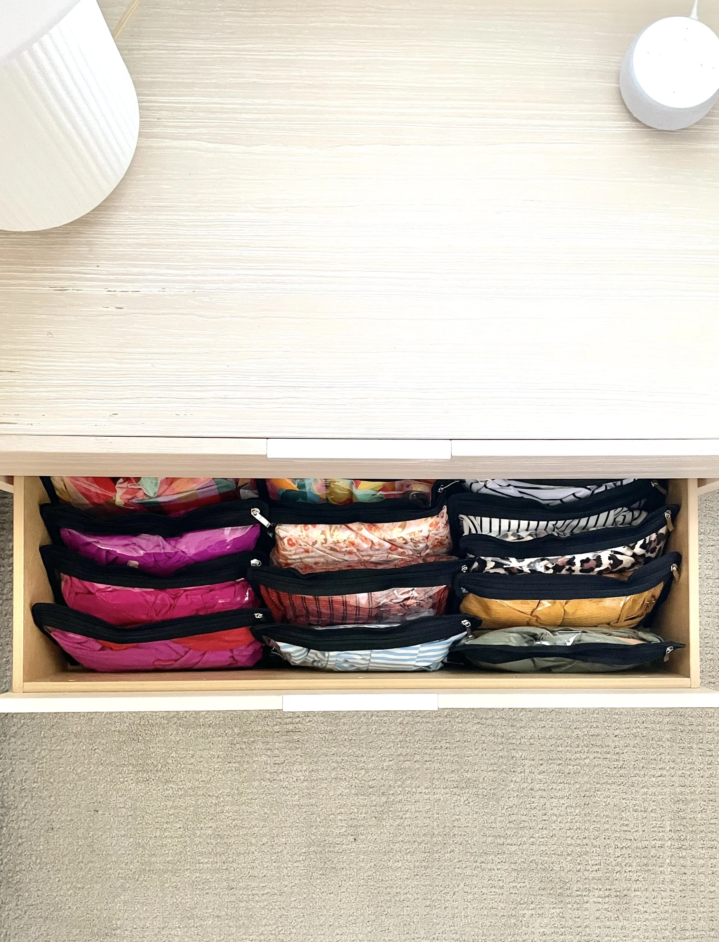 Let’s get those swimsuits organized ! I was so sick of my swimsuits being in a giant pile of mess inside my drawer. I would repeatedly fold them and organize them and they would eventually get all tangled up again with all the straps and pieces missing somewhere in the jumbled pile of suits. Finally I thought up this plastic zipper pouch idea! It’s solved my problem and I can see all my suits at the exact same time! Plus when I pack for a trip I can grab the ones I need and throw them in my suitcase. As always links below!